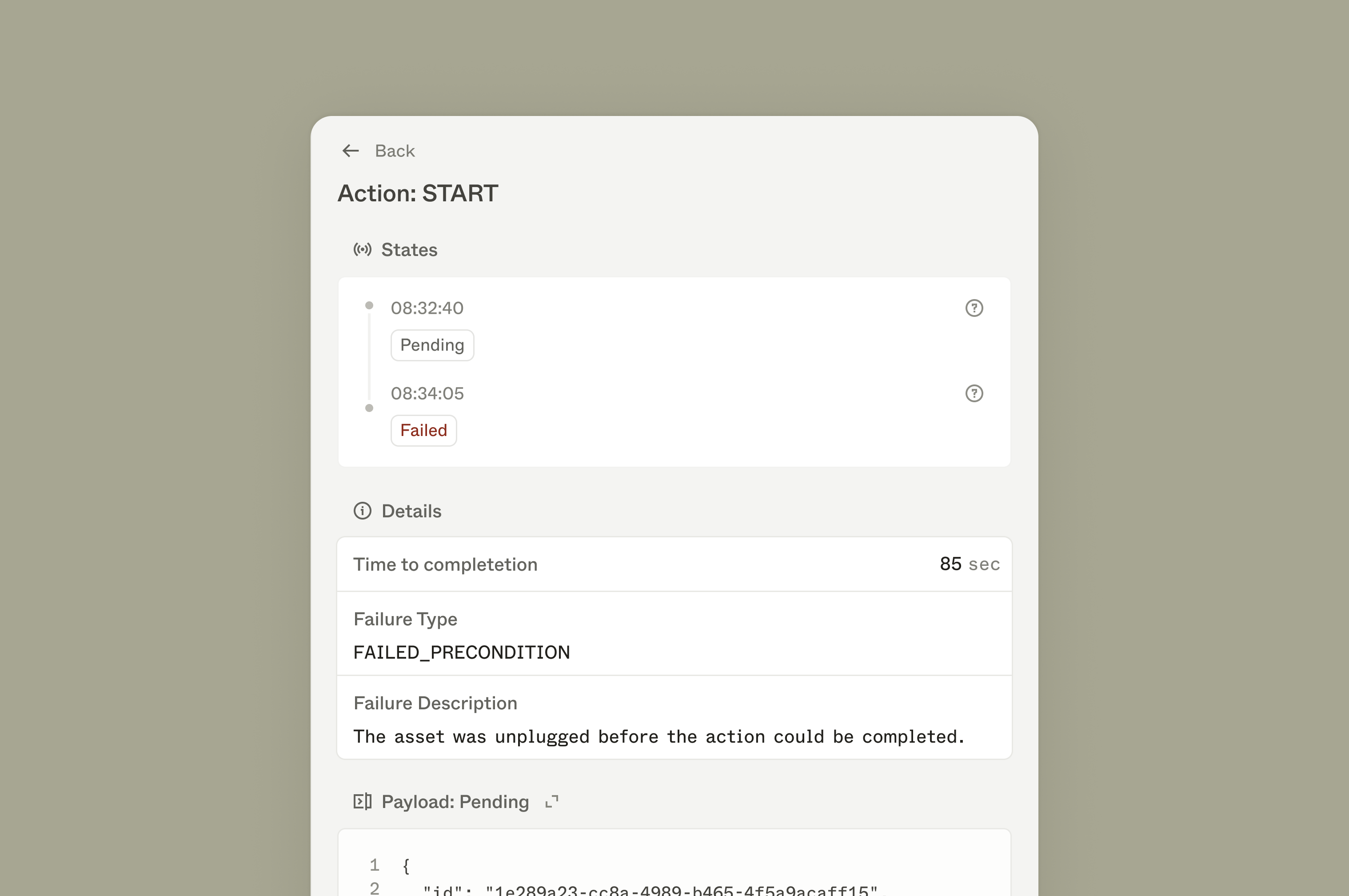 This can help you determine whether the failure was caused by the asset, the integration, or an external condition (e.g. vehicle not plugged in).
