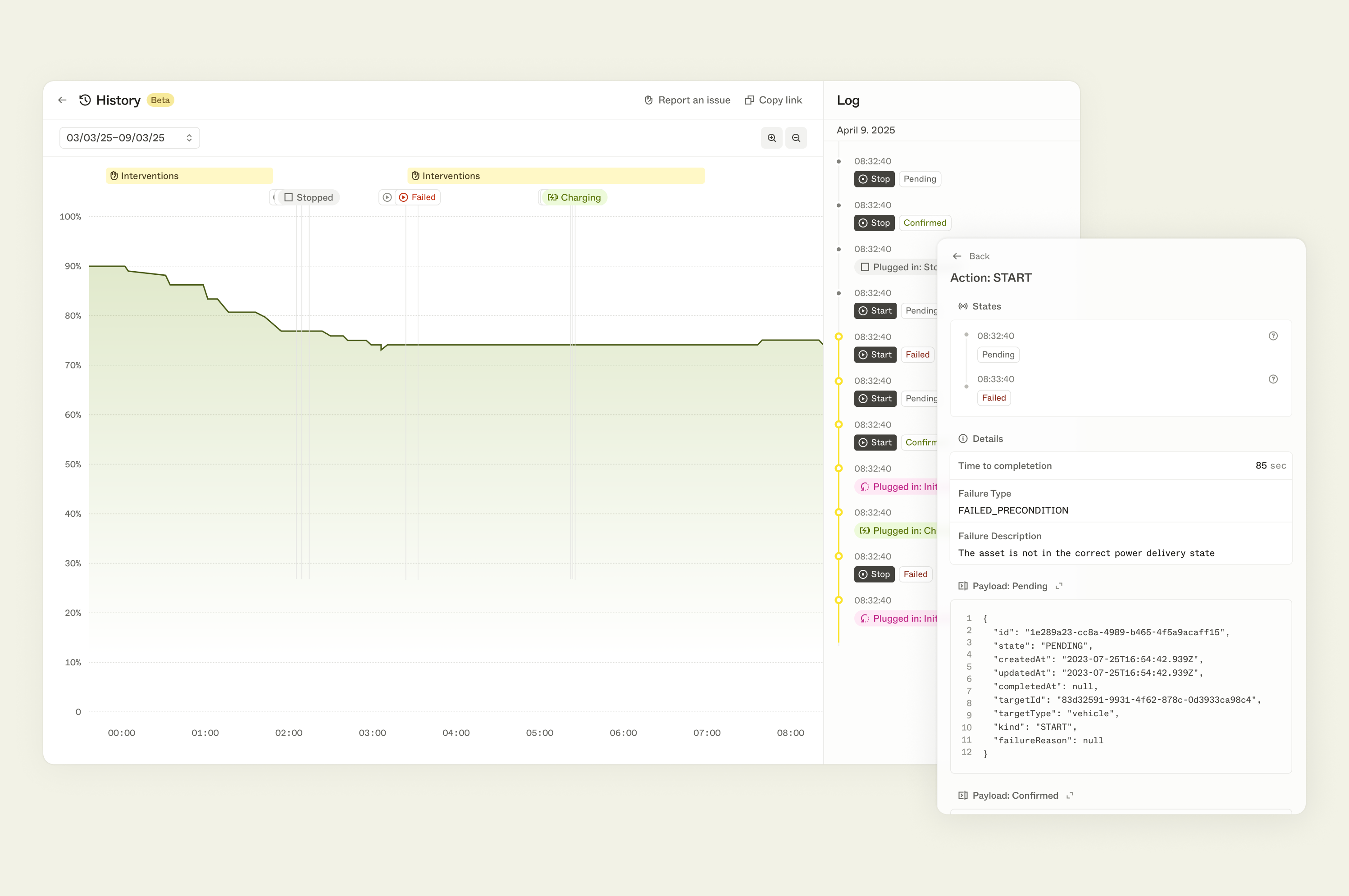 Asset history helps you understand what is happening with a vehicle by visualizing key events over time, like charging actions, power delivery states, and interventions.