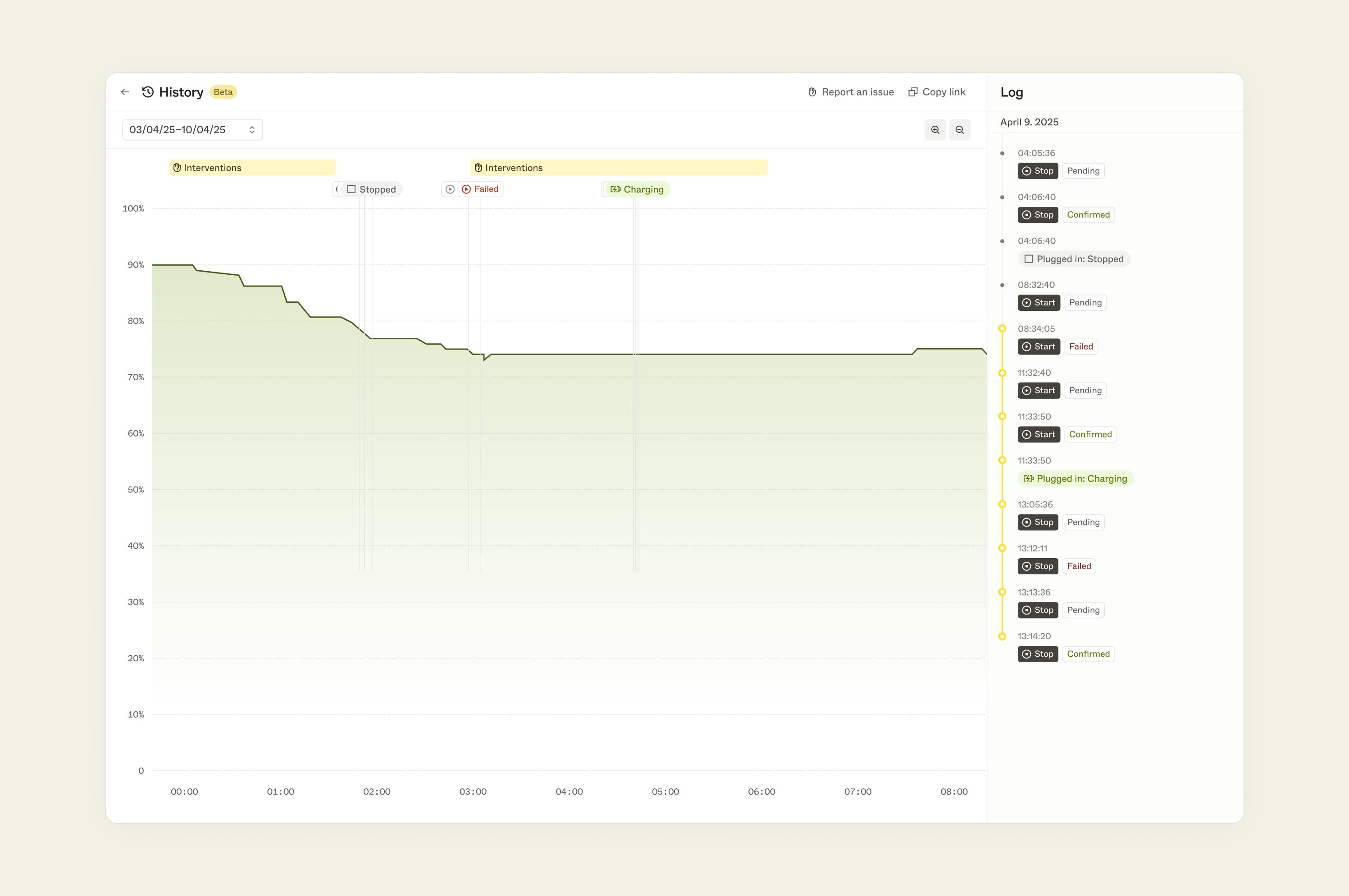 Clicking on any state of charge event in the timeline or log opens the Event detail view. This gives you context on what happened and what state the vehicle was in at the time.