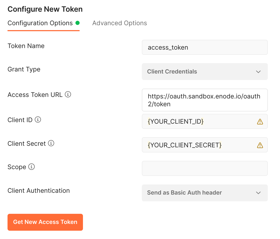 First, call the Enode OAuth API using client_id and client_secret.