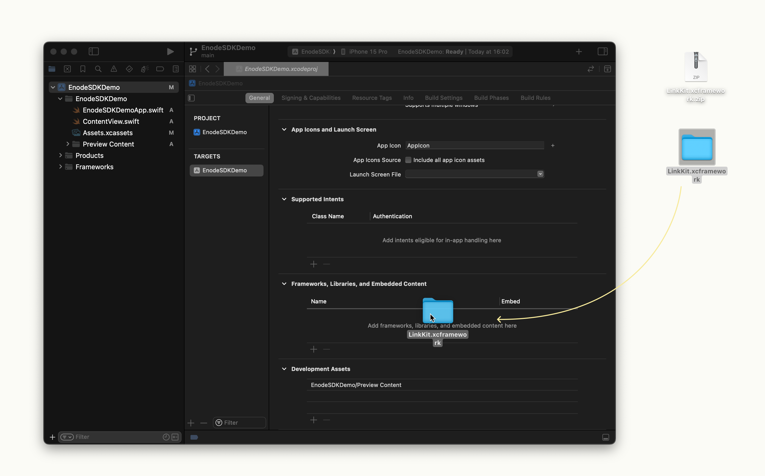 Extract the zip archive and keep the folder LinkKit.xcframework somewhere convenient.