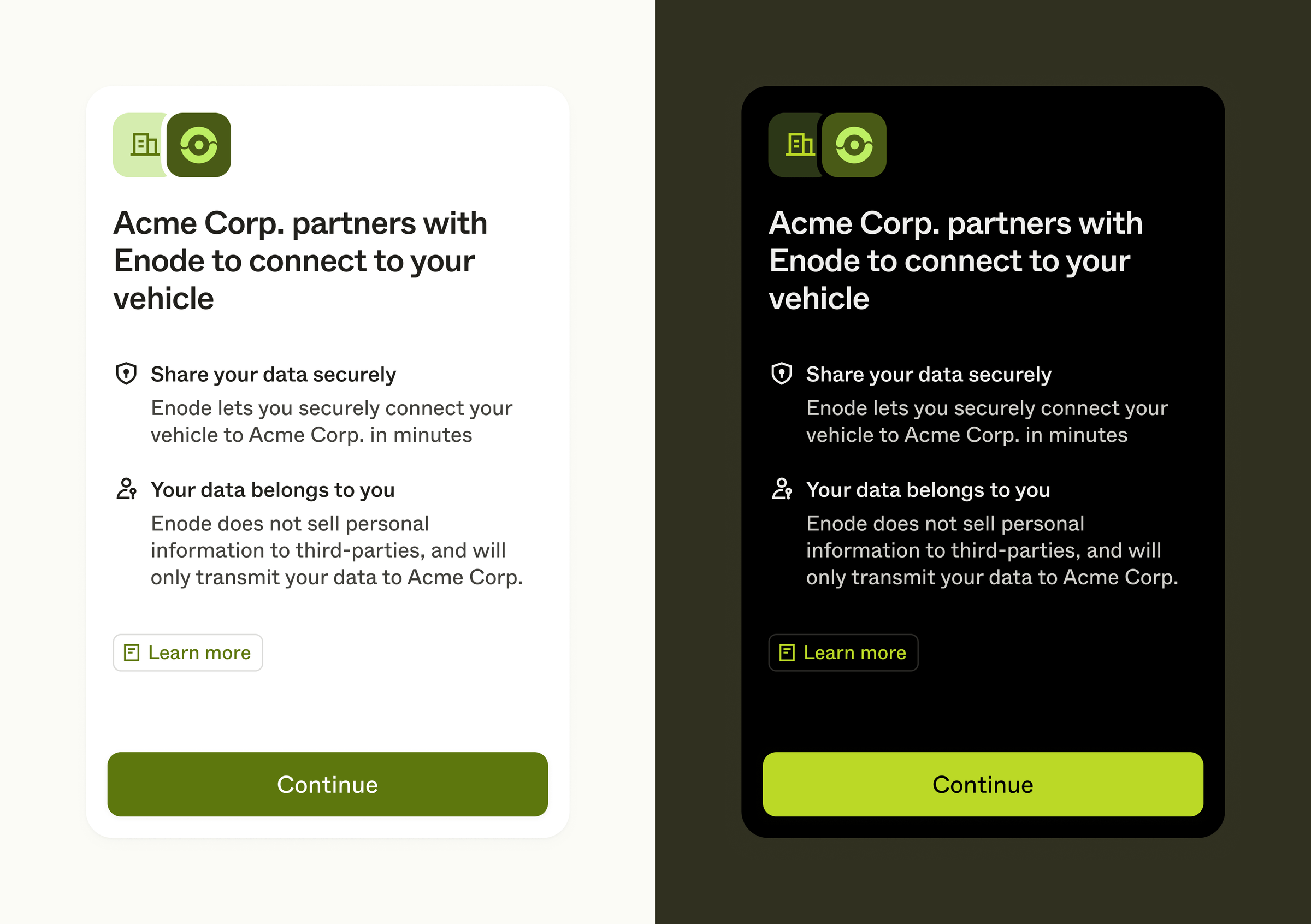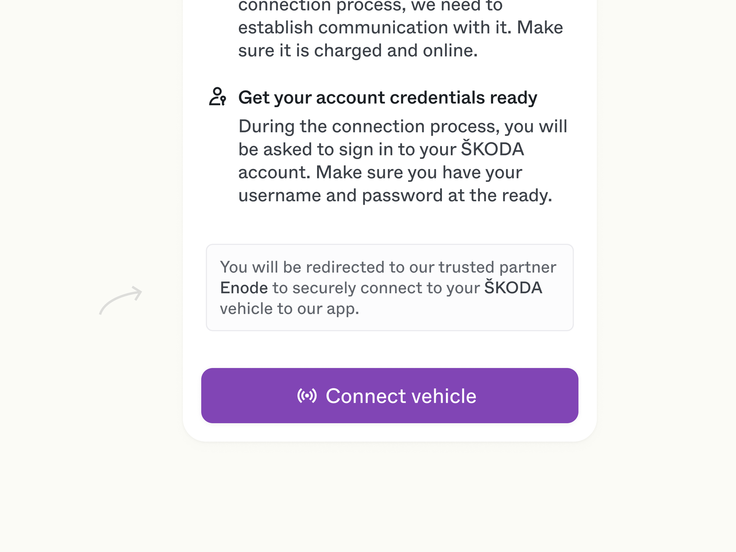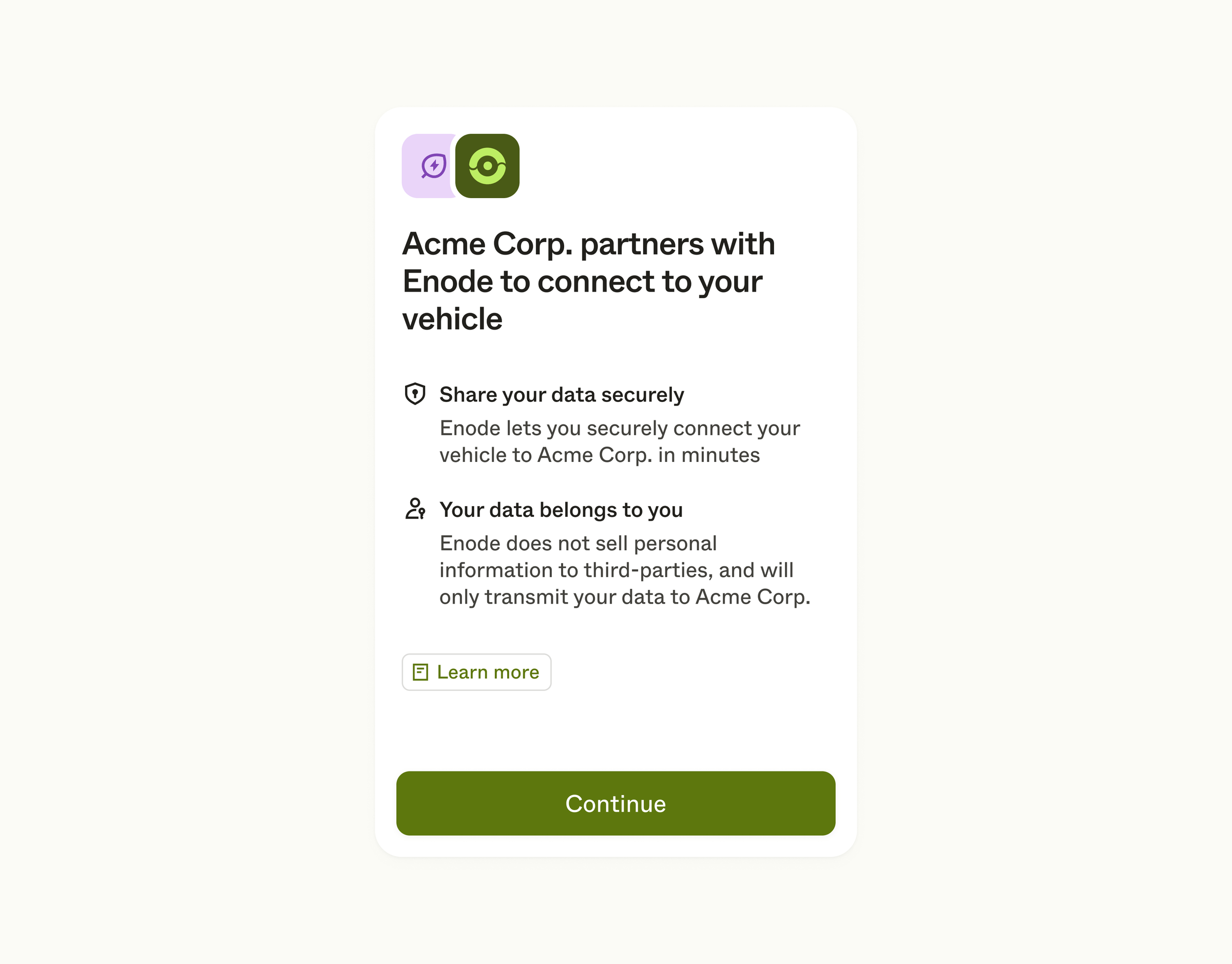 Your user can tap the Learn more button to bring up a modal view going deeper on Enode and our role in the connection process.