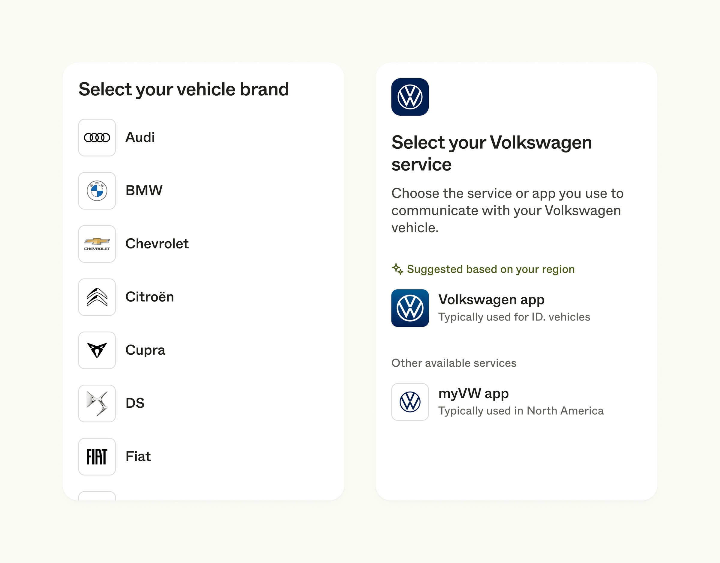 Next, your user will select the brand of their device. Additionally, some brands will have multiple services or apps available to their users, often split by geographic regions or specific models. In this case your user needs to choose the service or app they use to communicate with their device. Where possible, suggestions will be presented based on the region your user is visiting from.