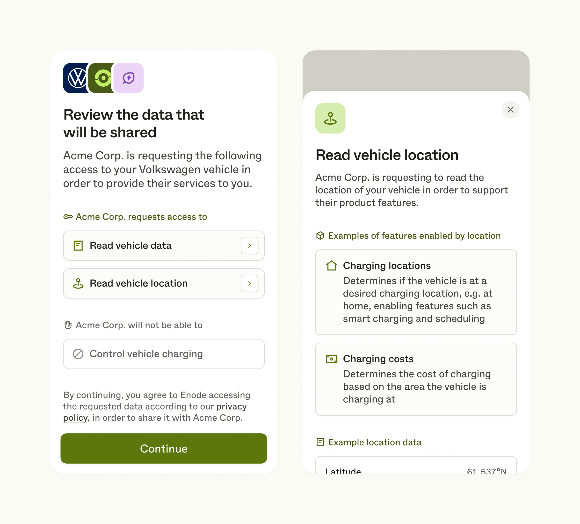 Once your user proceeds from here by tapping Continue, it is considered as consent for data processing as required by GDPR regulations, and to Enode's privacy policy.