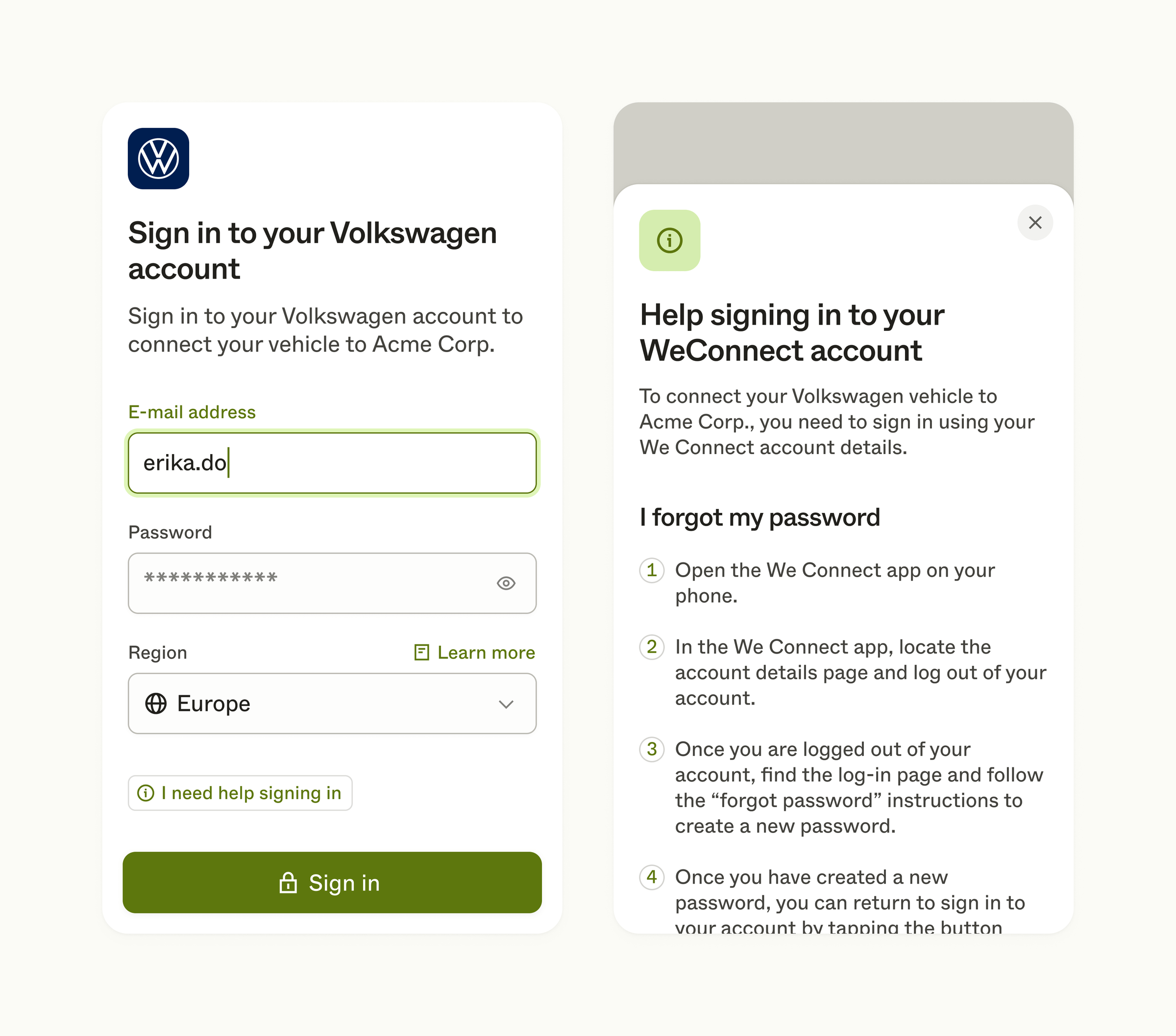 The type of account credentials presented in the initial sign-in step are specific to each brand, service or app — and vary from e-mail and password combinations to phone numbers only. In some cases, if a brand has split their service or app infrastructure into multiple regions, a region selector will be visible with the region of your user pre-selected.