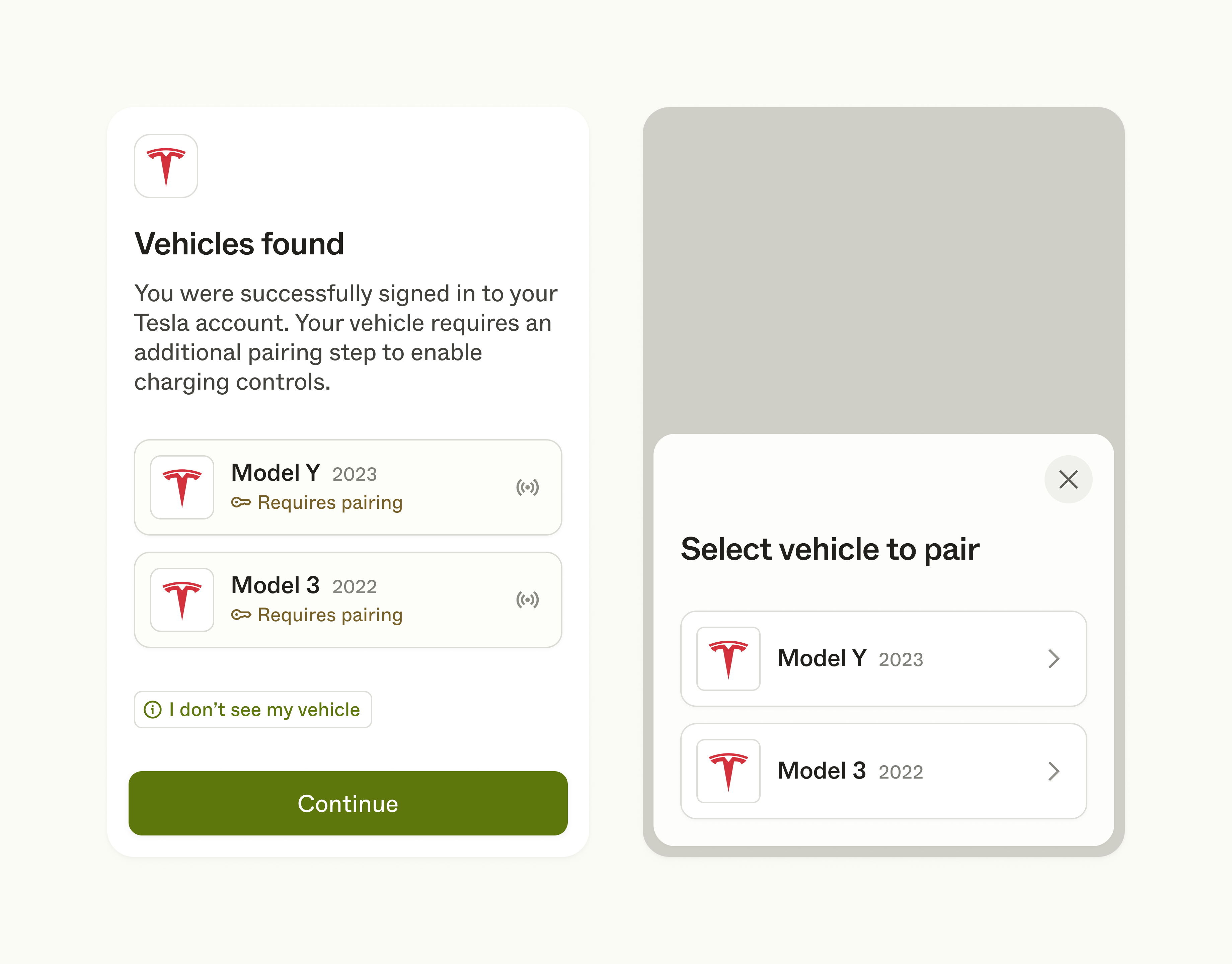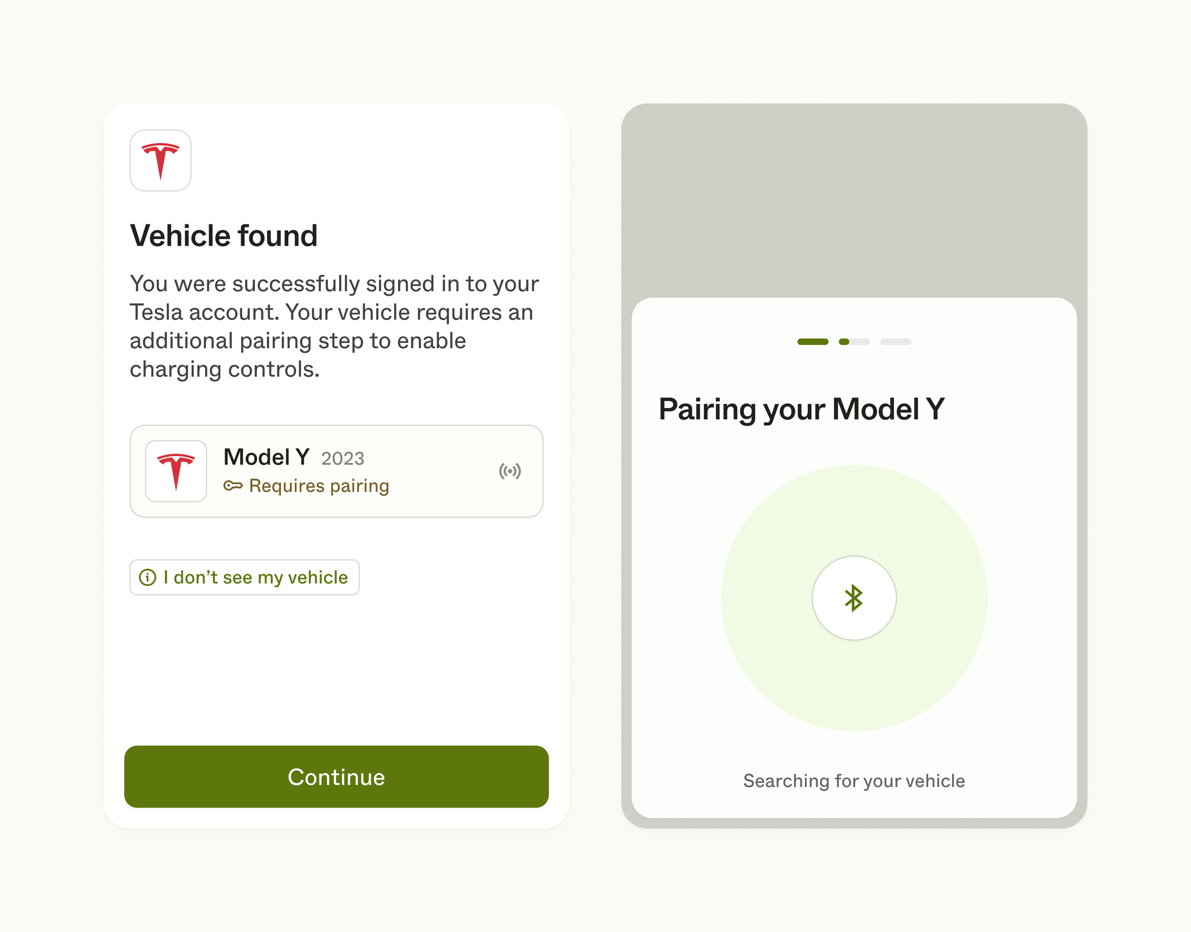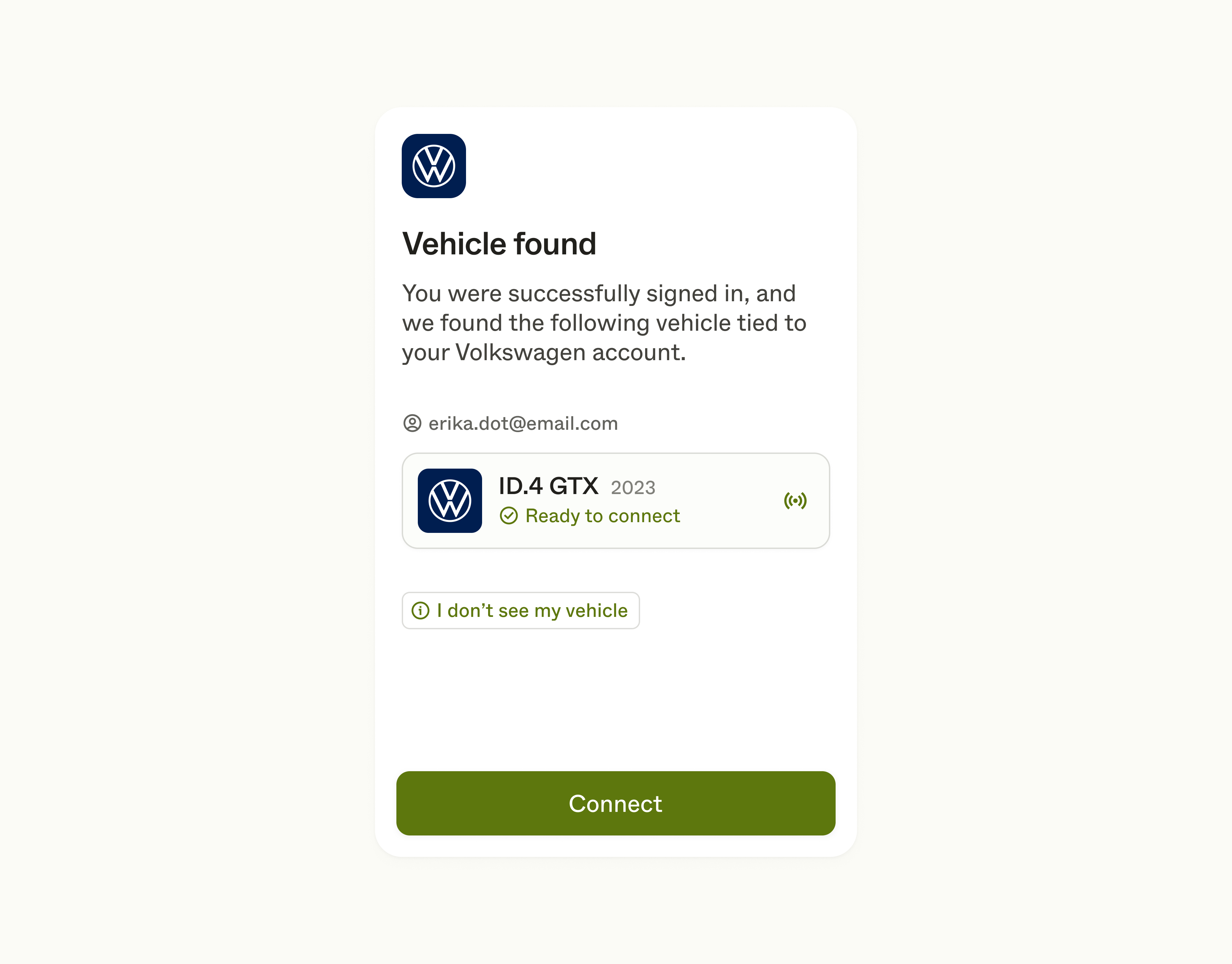 If they do not see the device they expected to see, they can open a modal help view (e.g. I don’t see my vehicle) for further assistance. After tapping Connect, they will be presented with a success view.