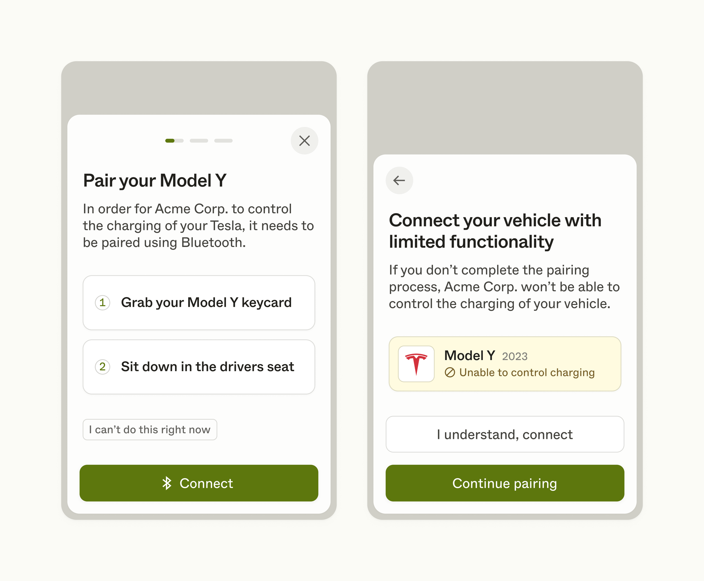 For cases where your user cannot physically access their vehicle at the time of linking, they will be able to skip the process by pressing I can't do this right now. As a heads-up, they will be informed that the vehicle(s) they wish to connect without pairing will have limited functionality. After sucesssfully connecting their vehicle(s) with limitations, a re-linking intervention will be registered, which allows your user to go back into the Link UI flow to pair their vehicle(s) with Bluetooth.