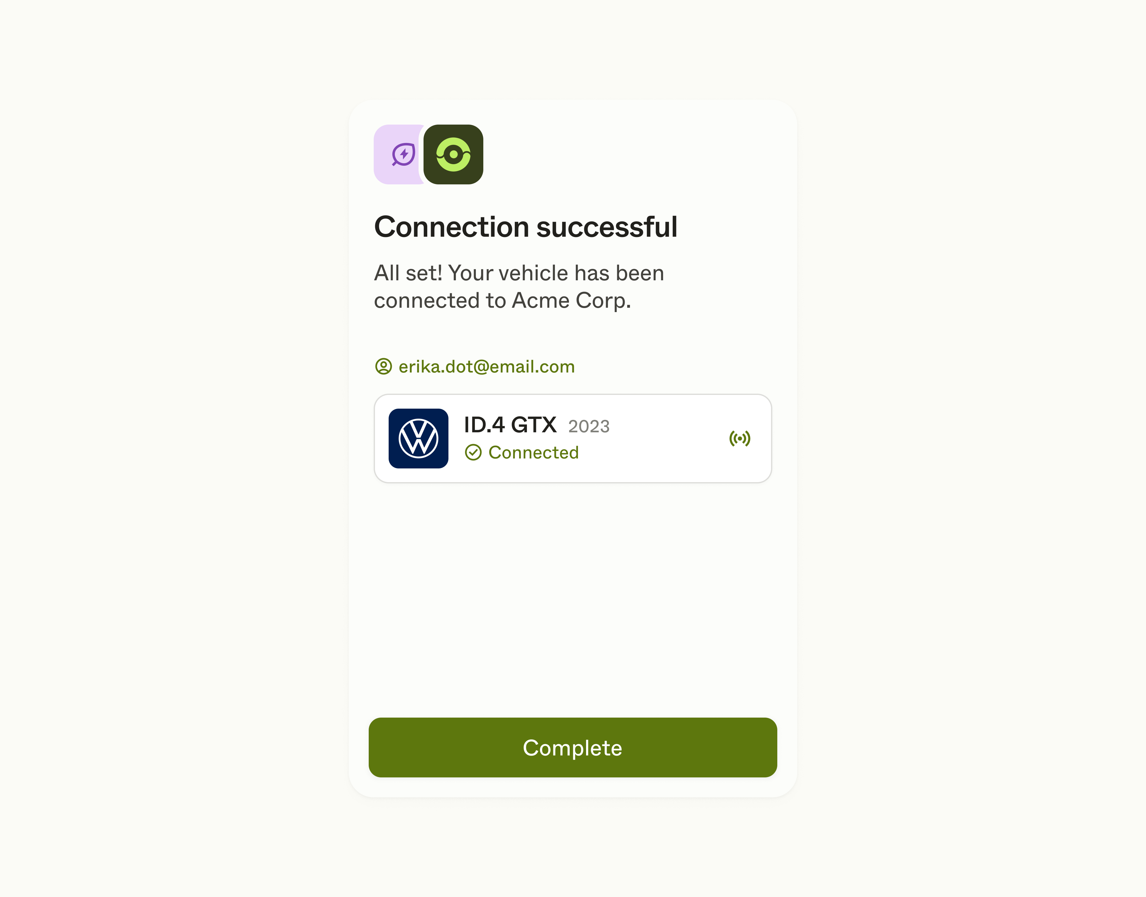 Lastly, your user will get a connection confirmation. By tapping Complete, they will be redirected back to your app.