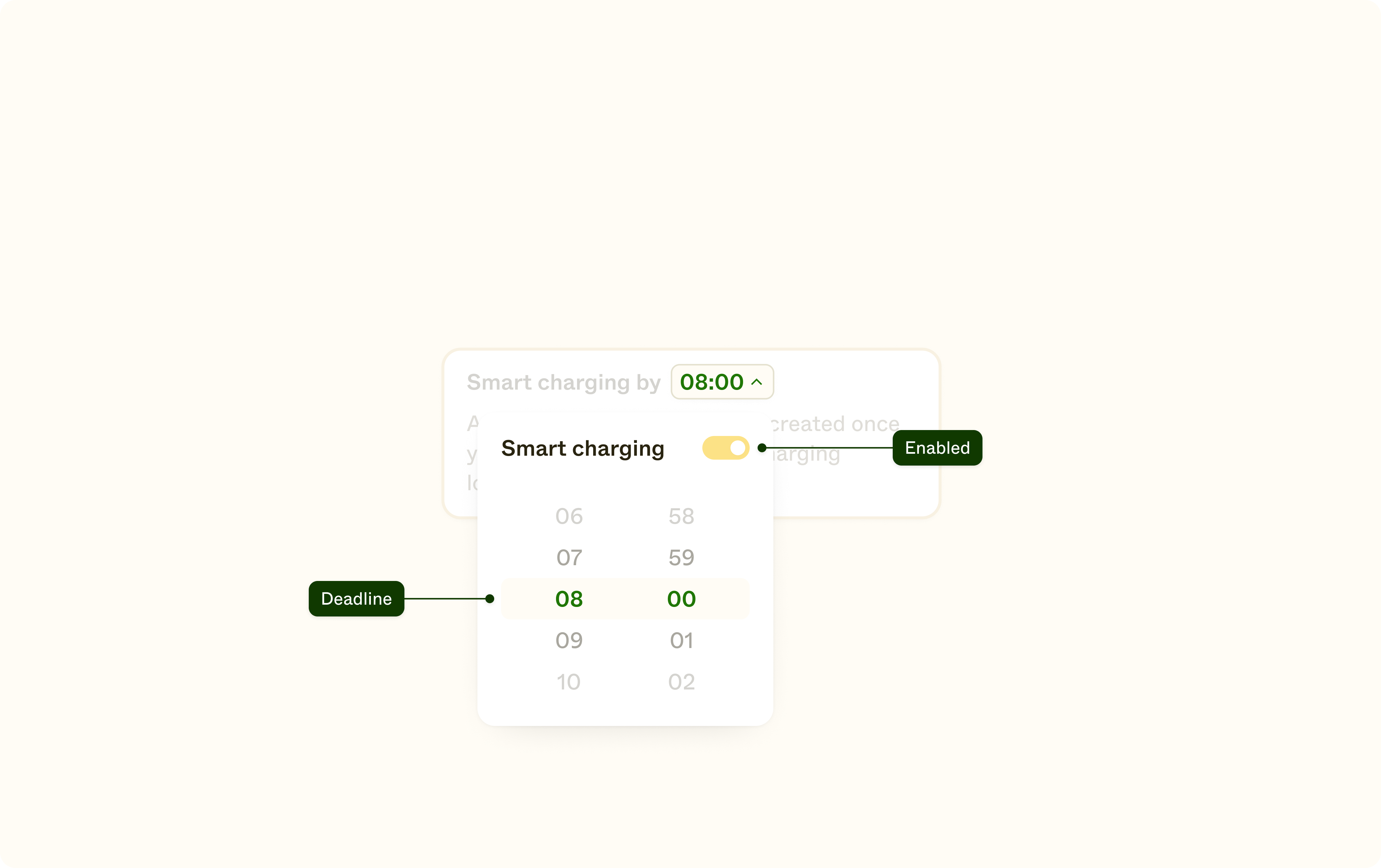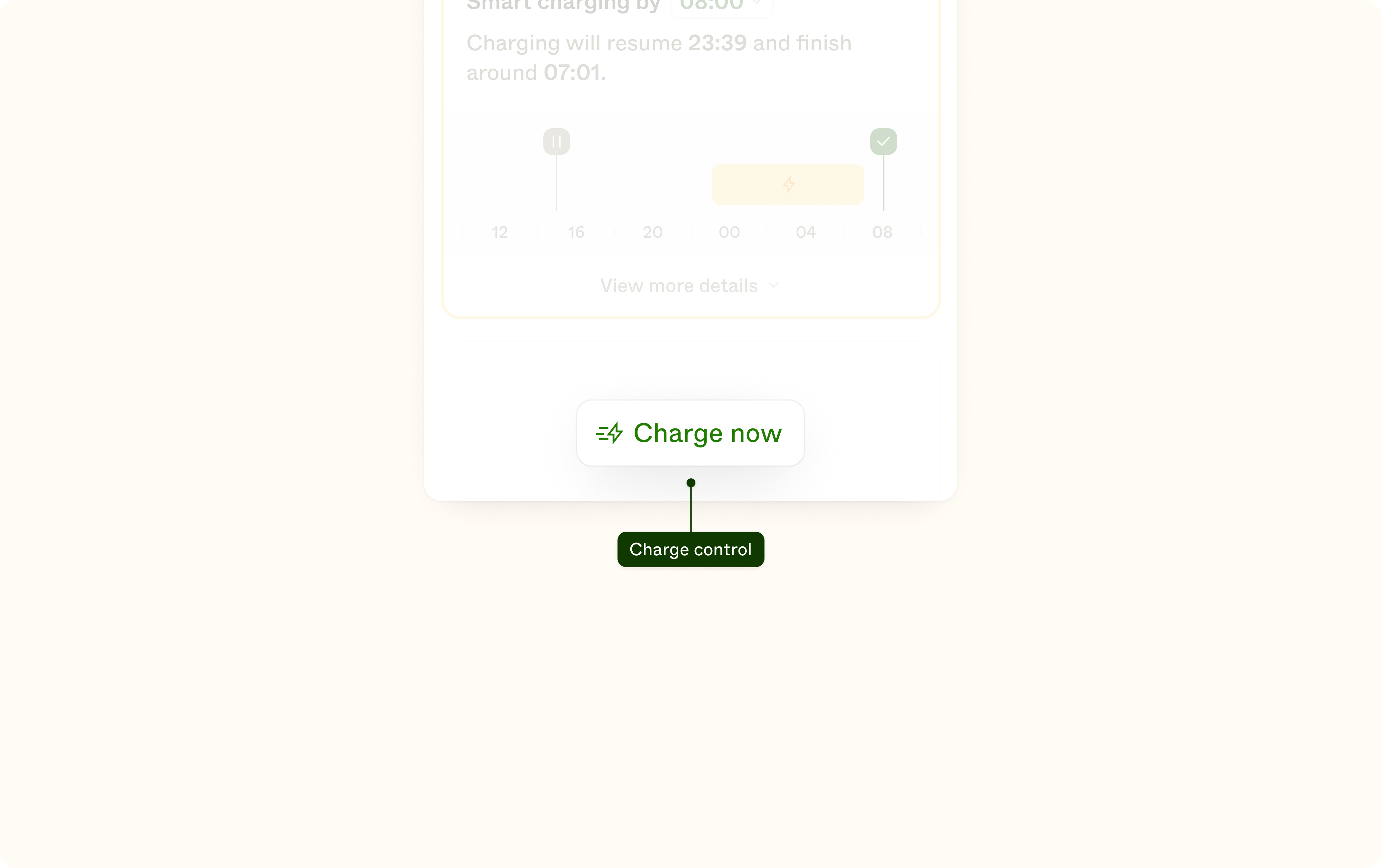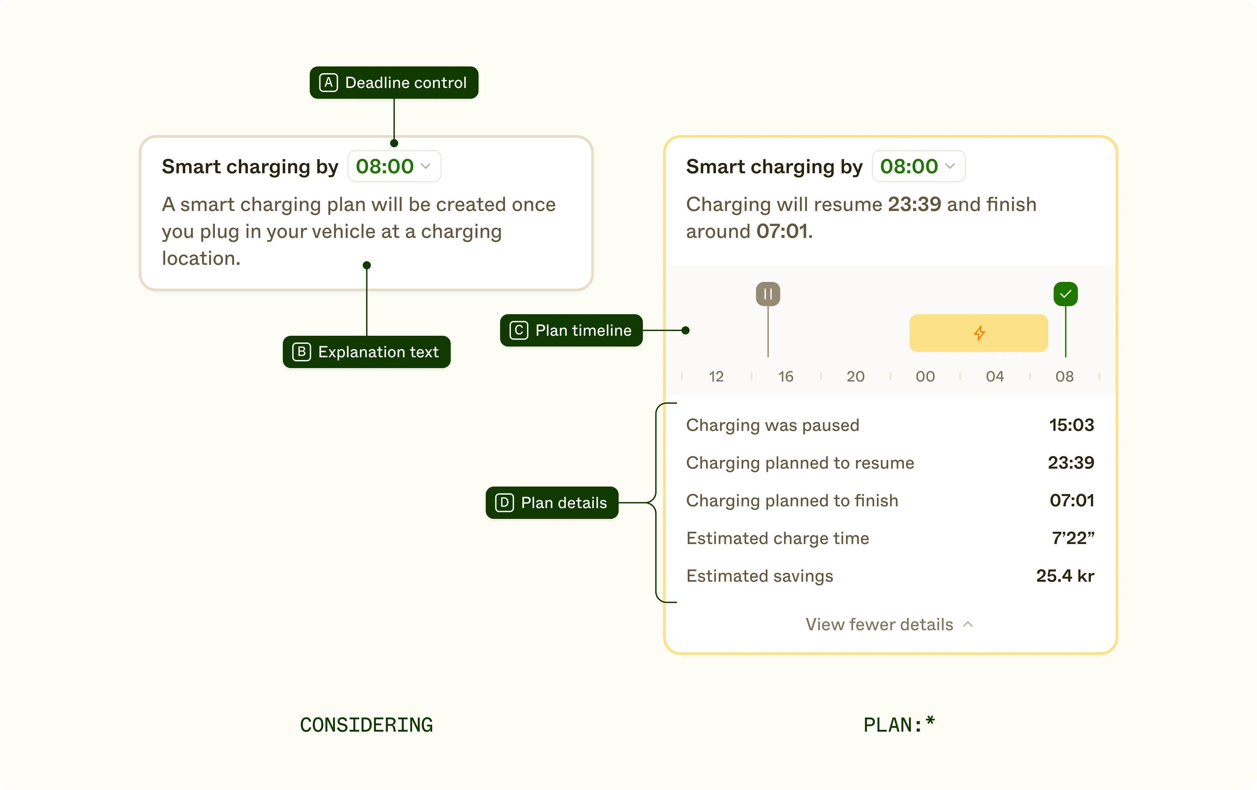 - Smart charging control + information — Always relevant control for the deadline, contextually relevant information about