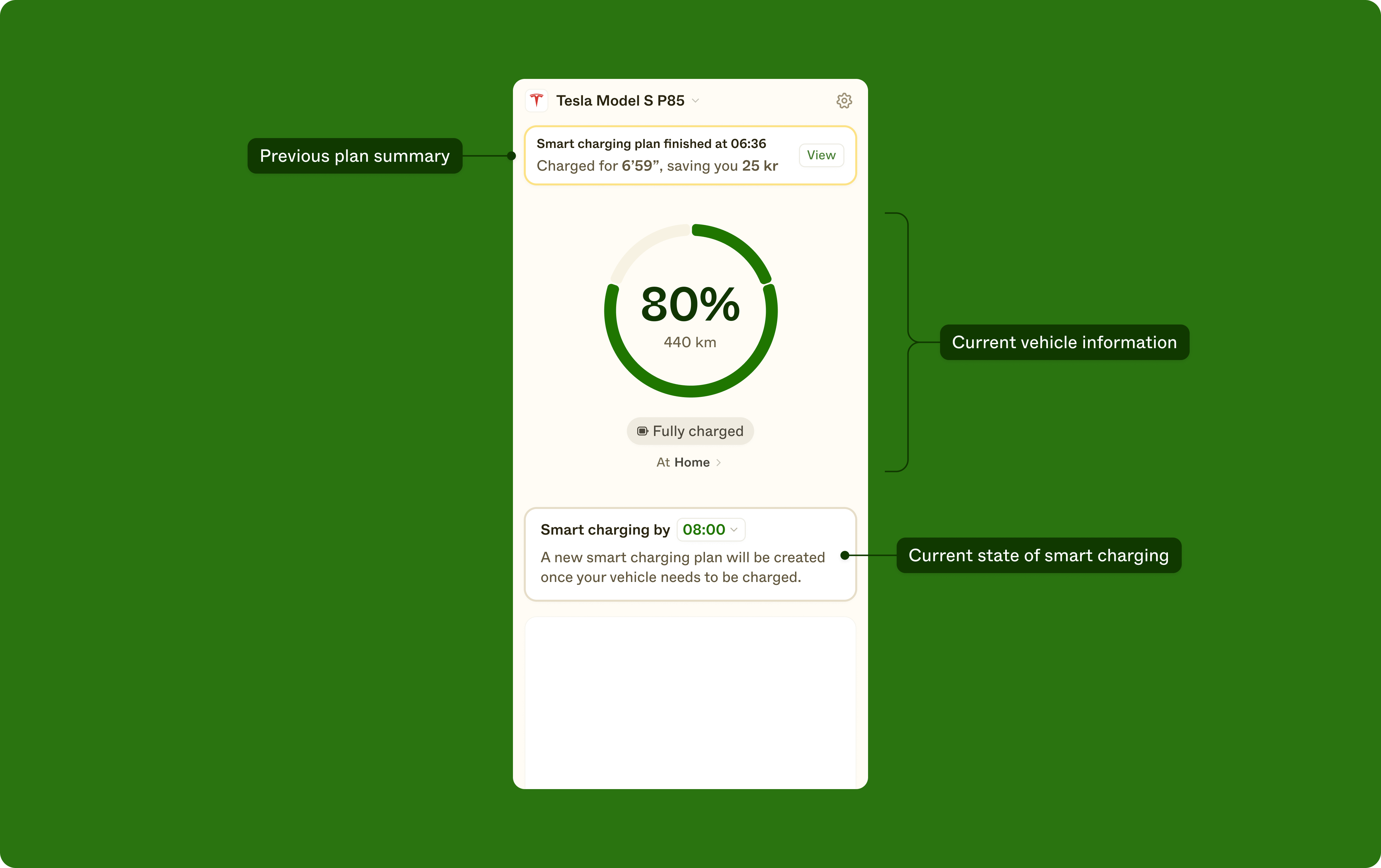 Bis placed just below so it can be reviewed together with the vehicle informationAin a container with flexible height allowing for other relevant content like charging statistics to surface when there is no plan present. - The charge control