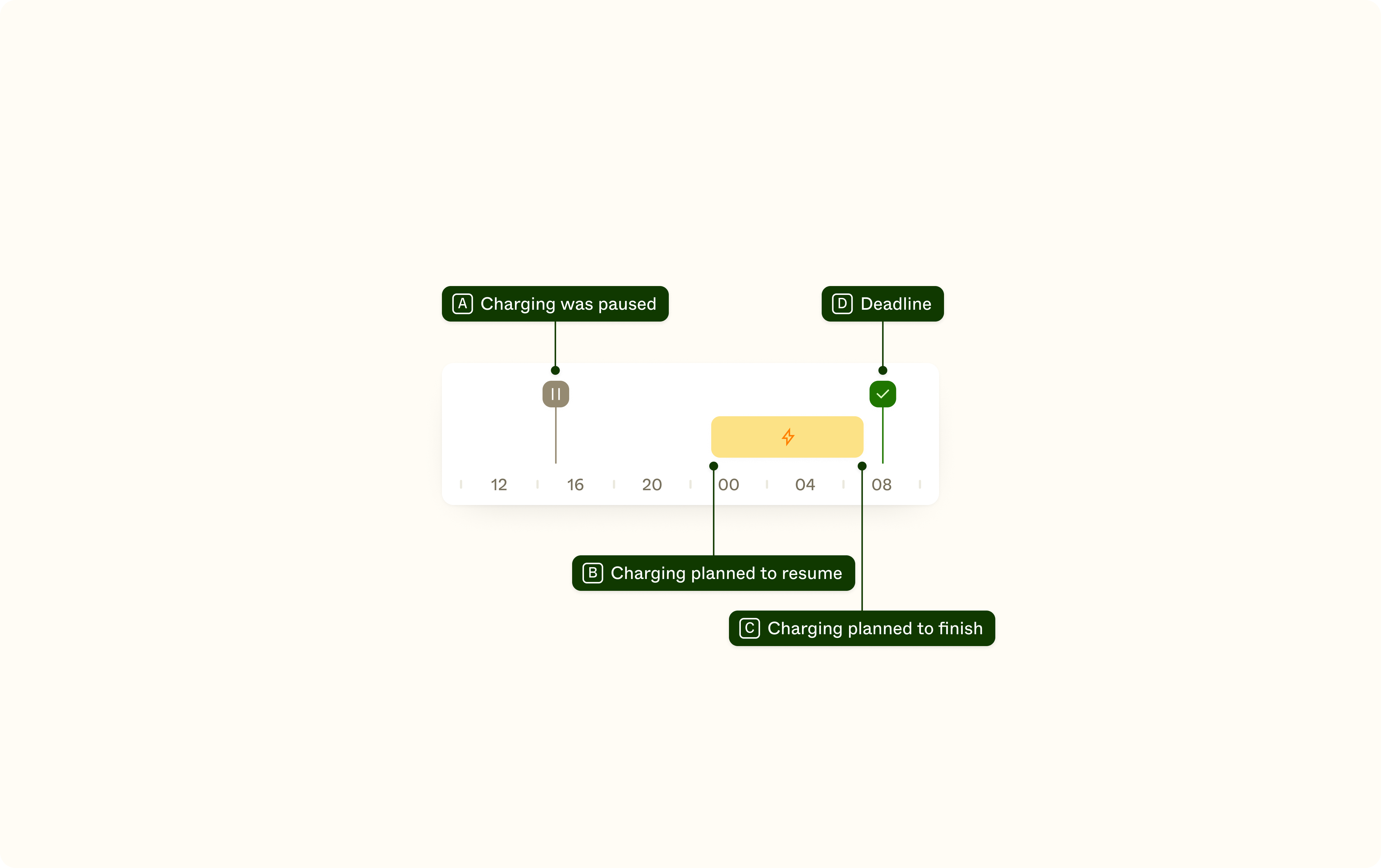 The timeline can be constructed from the plan object. In this case, the horizontal axis is created dynamically by rounding down from the time charging was paused (A) and rounding up from the user-defined deadline (D) from the smart charging policy. The charging window is visualized by the planned start (B) and stop (C) times.