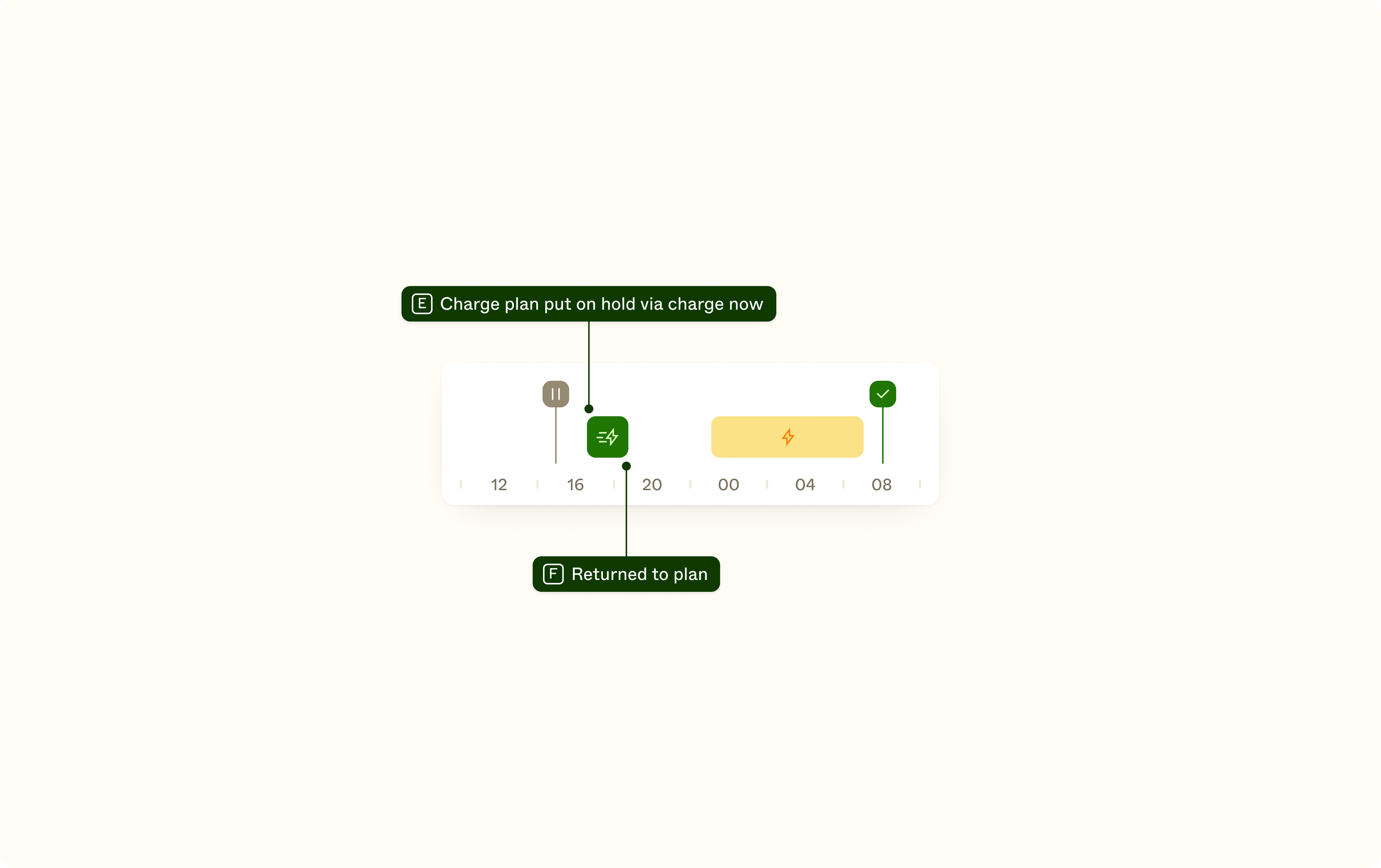 status.state === "PLAN:EXECUTING:OVERRIDDEN" → status.state === "PLAN:EXECUTING:STOPPED" | Returned to the smart charging plan. Charging will resume HH:MM {startAt} and finish before HH:MM {estimatedFinishAt}. |